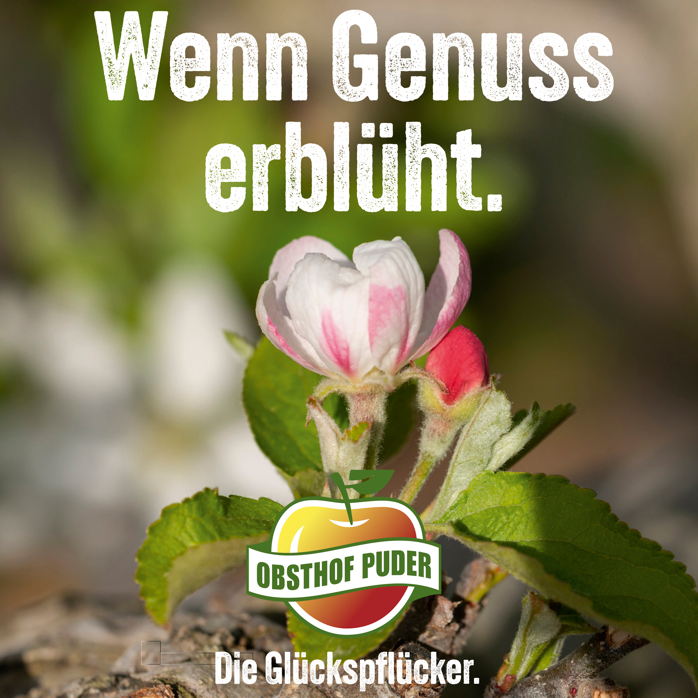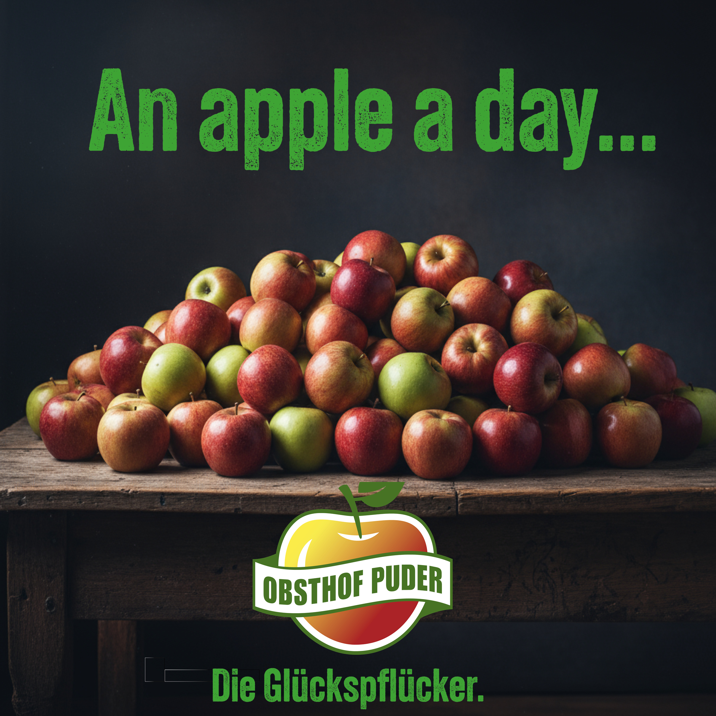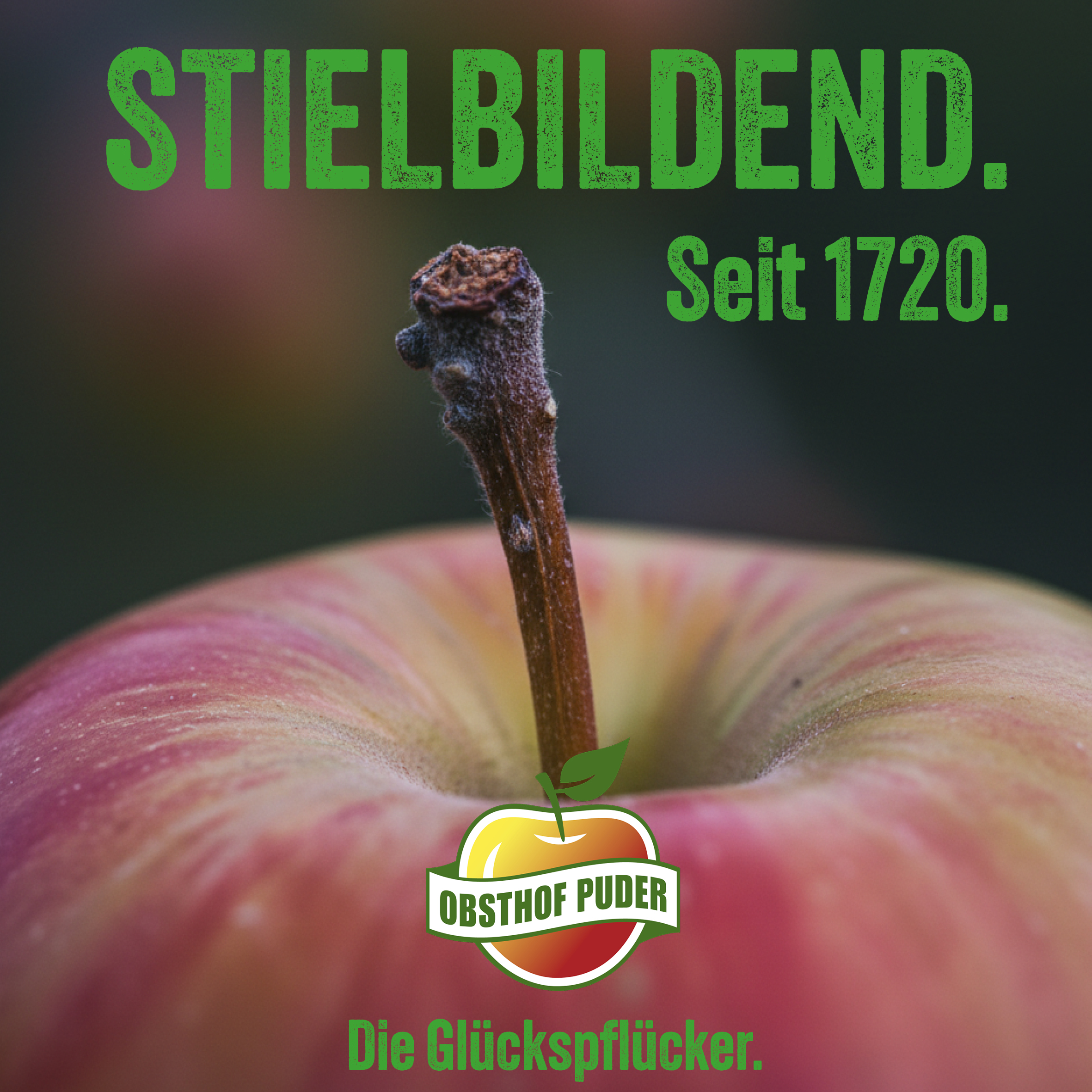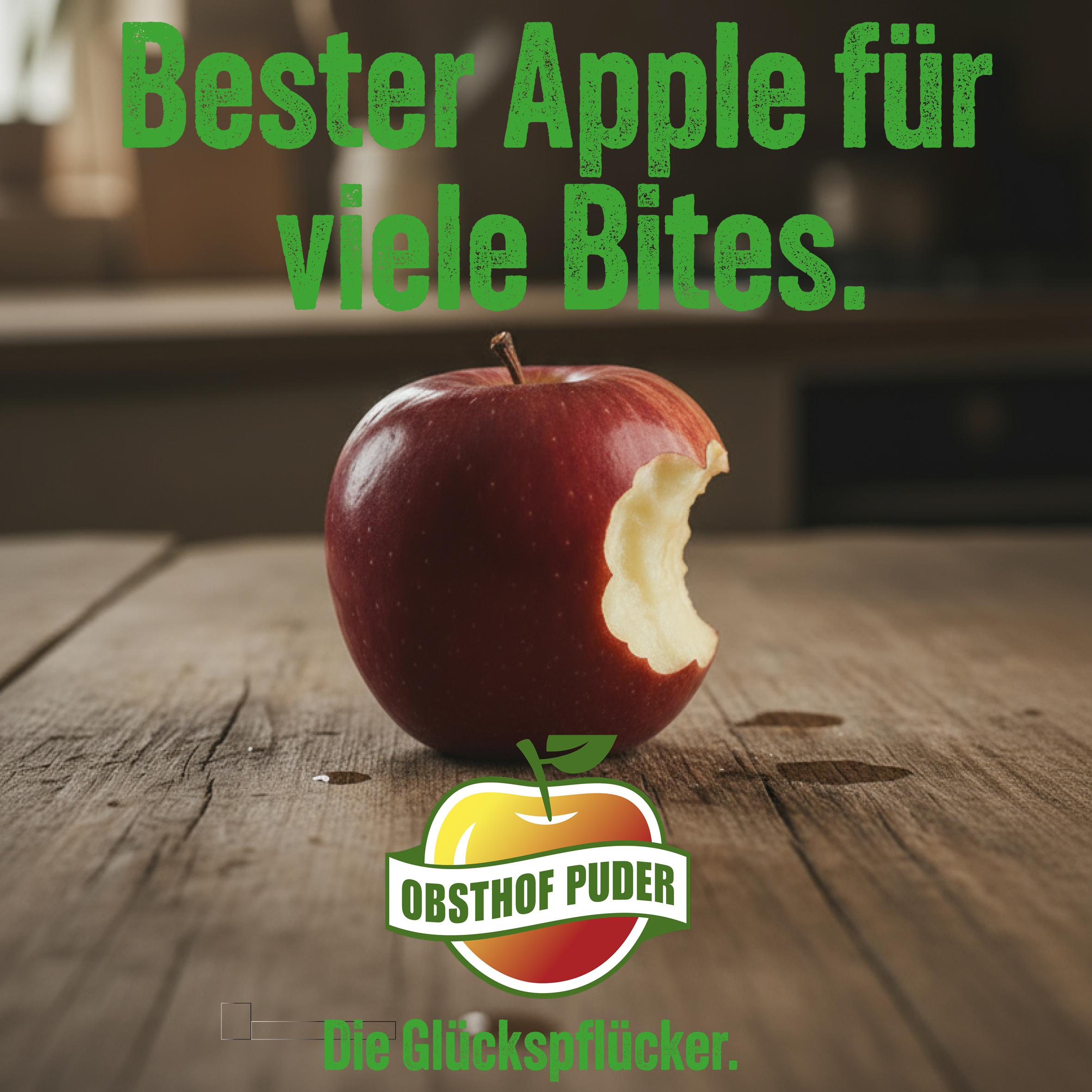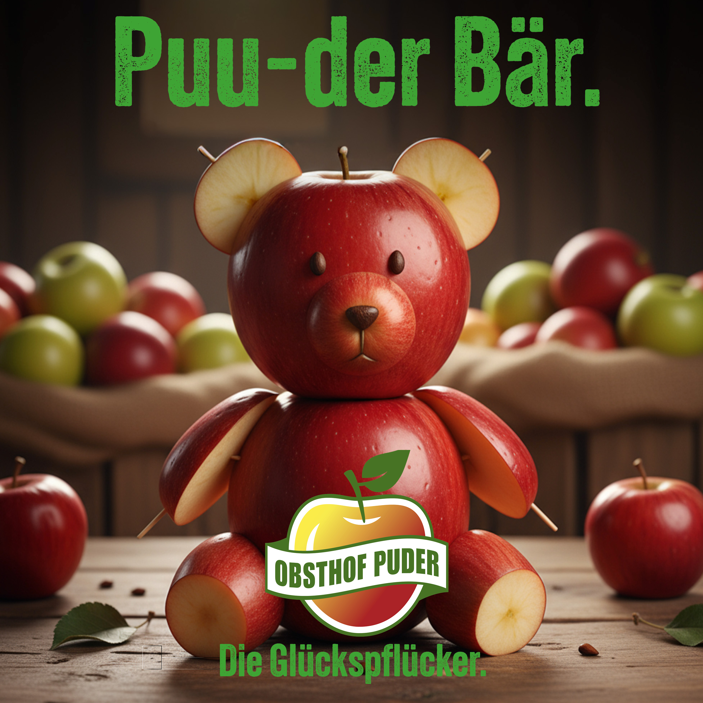 Außergewöhnliche Headline trifft KI-erzeugtes Motiv, denn alle Packshots sind generiert. Eine praktikable Lösung für Unternehmen wie dem Obsthof Puder, die nicht ihr Geld in teure Werbeproduktionen stecken wollen.